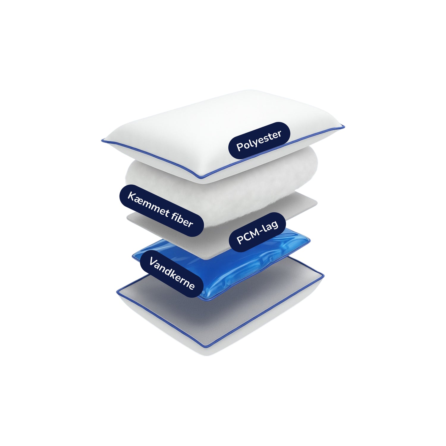 Vores RestCloud™ vandpude er konstrueret i fire nøje udvalgte lag, der tilsammen giver optimal støtte, trykaflastning og lang holdbarhed. Det øverste lag af polyester og kæmmet fiber sikrer en blød og behagelig overflade, mens PCM-laget regulerer temperaturen gennem natten. Nederst ligger den fleksible vandkerne, som tilpasser sig dine bevægelser og giver den unikke flydende støtte.